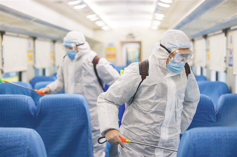 在全国高铁客流第一站广州南站,每天深夜23时30分,负责疫情防控工作的客运值班员司淋涛准点开始“清场”,近7万平方米的广州南站候车室内,地板、座椅、电梯等每一个需要消毒的角落都必须认真进行消杀。全站消毒作业完毕时,已是凌晨5时。
