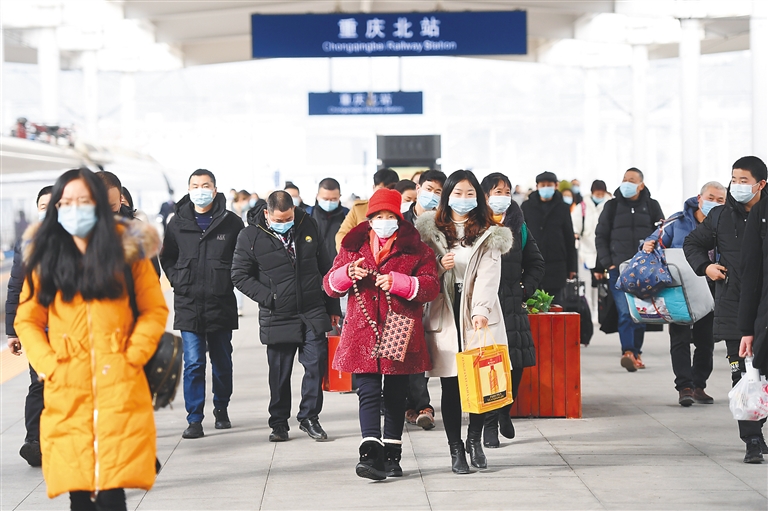 1月28日,2021年春运大幕拉开。2021年春运从1月28日开始,至3月8日结束,共40天。图为乘客在重庆北站乘车。 新华社记者 唐奕 摄
