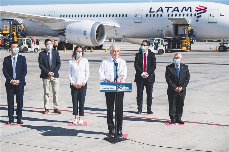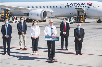 1月28日,首批近200万剂由中国科兴公司生产的新冠疫苗运抵智利首都圣地亚哥。智利总统皮涅拉(右三)、卫生部长帕里斯和中国驻智利大使馆临时代办周仪前往机场迎接。新华社发