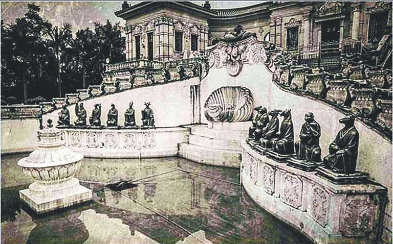 在1860年那场大火之前,以中式园林著称的圆明园中却涵纳着一处欧式的景观,在这处欧式景观的中心,是一座西洋风格的宅邸,这里就是圆明园的海晏堂。河清海晏,自然少不了水,海晏堂园林的正中心是一个大水池,铜兽首就按照天干地支的次序整齐地交叉排列在水池的两侧,南侧为子鼠、寅虎、辰龙、午马、申猴、戌狗,北侧为丑牛、卯兔、巳蛇、未羊、酉鸡、亥猪。
