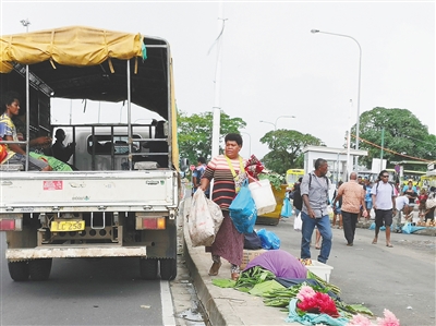 1月30日,一名女子(中)在斐济苏瓦的市场采购物资。