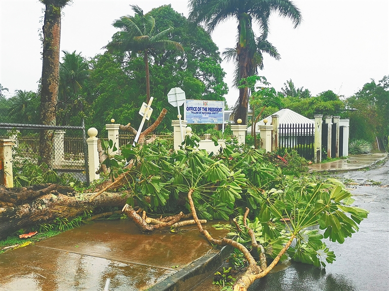 这是1月31日在斐济苏瓦街头拍摄的被吹倒的树枝。