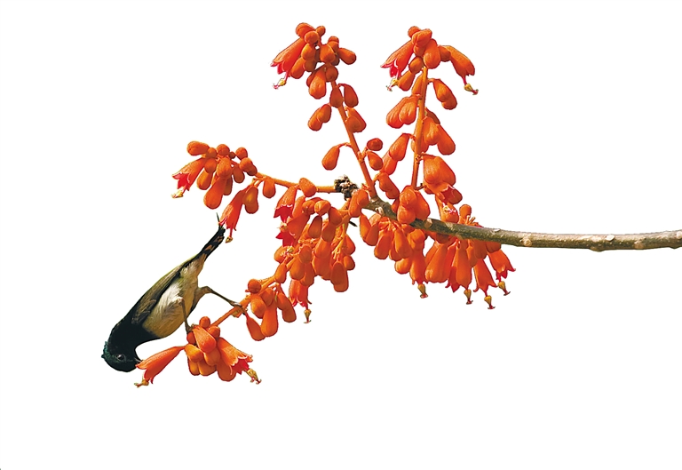 海南梧桐是中国梧桐科梧桐属植物中分布最南的一种,与梧桐“血缘”关系最亲,外形与习性也颇为相似。而隶属于梧桐科火桐属的美丽火桐,从外观便一下与前者区分开来:树皮似厚皮树,树叶似三角枫,花蕊似炮仗花,每逢花季树叶脱光,只剩满树红花,煞是好看。