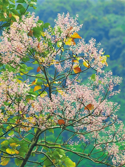 每年4月前后,到访昌江霸王岭、陵水吊罗山、海口石山地区、乐东尖锋岭及佳西自然保护区一带的热带季雨林中,会看到一株株树干高大直立、苍劲挺拔的海南梧桐伫立,枝头萦绕着一团团烟雾般的白黄色小花,让人怦然心动。