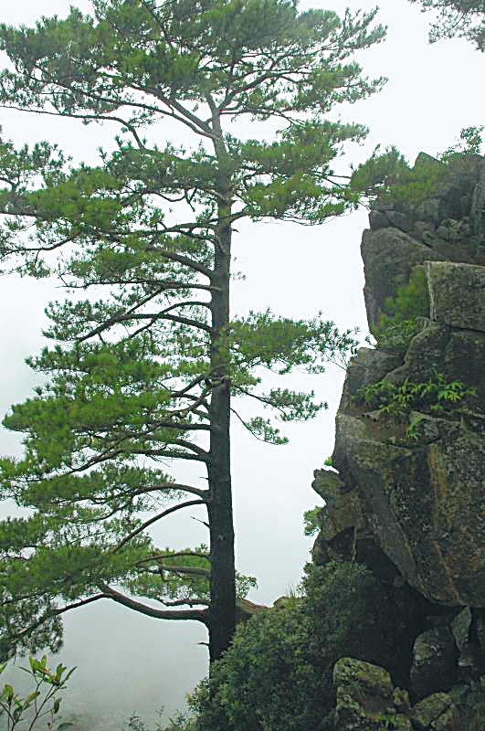 没有牡丹的娇贵,也没有竹子的细长,但那红褐色的树干就像旗杆,高高伫立在山岭怪石中,树枝一层一层的向外舒展,似迎风飘扬的旗帜,任凭风吹雨打,依然昂首挺胸,这便是仅存于霸王岭的雅加松。