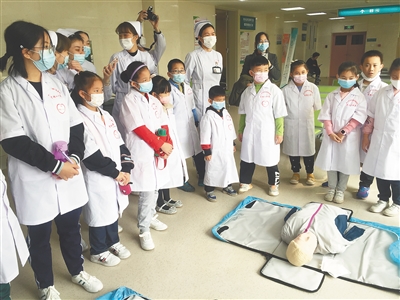 “我将非常尊重和学习我们的医学前辈历经千辛万苦所获得的科学成果及医学知识……”活动一开始,“小医生”们集体朗读希波克拉底誓言,感受医护人员的神圣使命和肩上重任,增强孩子们对医生这个职业的敬仰之情。