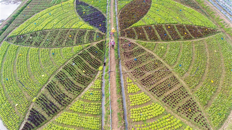 2月3日,琼海市嘉积镇的农民在田园里管理花圃。