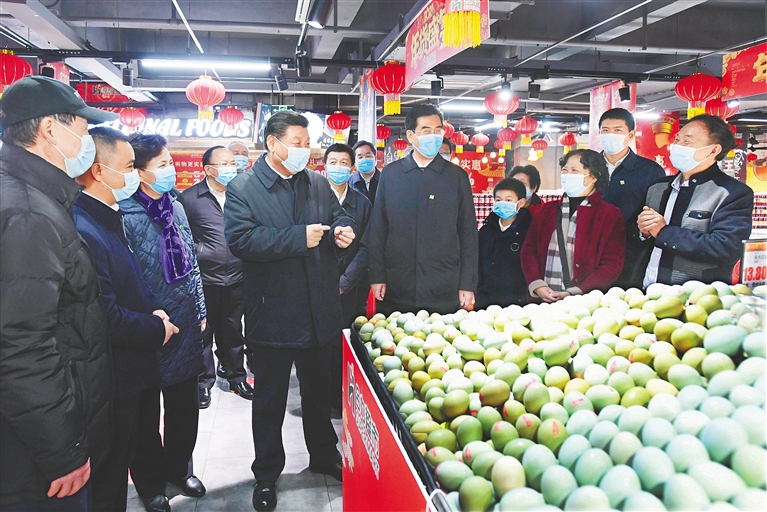 前来置办年货的群众热情向总书记问好。习近平亲切询问大家年货备齐没有。习近平强调,各级党委、政府和领导干部要把事关百姓切身利益的事情抓实抓好,尤其要落实防疫措施,加强食品安全监管,确保百姓过年安心、放心、舒心。