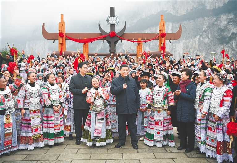 村文化广场上,乡亲们正在开展春节民俗活动,打起鼓、吹芦笙,载歌载舞,唱起了欢快的苗家迎客歌。看到总书记来了,大家齐声欢呼“总书记好”。习近平亲切地对乡亲们说,今年我们将迎来全面建成小康社会、实现第一个百年奋斗目标的伟大胜利。中华民族是个大家庭,五十六个民族五十六朵花。全面建成小康社会,一个民族不能落下;全面建设社会主义现代化,一个民族也不能落下。脱贫之后,要接续推进乡村振兴,加快推进农业农村现代化。希望乡亲们继续努力奋斗,把乡村产业发展得更好,把乡村建设得更美。临别时,乡亲们依依不舍簇拥着总书记,齐唱苗家留客歌,深情的歌声在乌江上空久久回荡。