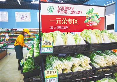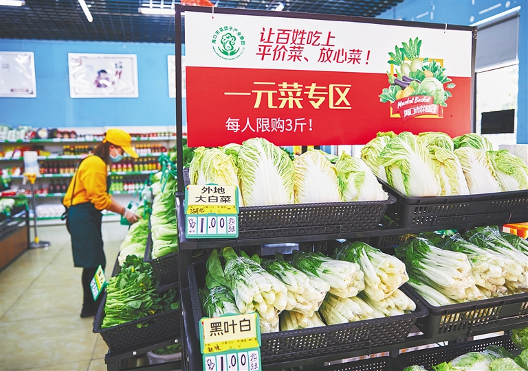 本报海口2月5日讯 (记者计思佳)“大白菜、黑叶白、金丝白,今天全都是1元钱1斤!”2月5日17时许,正是市民下班回家的时间,位于海口市秀英区长德路永秀花园小区门口的菜篮子社区平价店里,进出的人流络绎不绝。店长王丽华笑吟吟地站在“一元菜”货架前,热情地向大家介绍当天的特价菜。