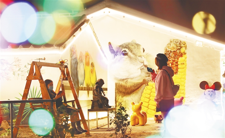 2月5日晚,海口江东新区权拥东村吸引游客前来“打卡”拍照。这是一个被称为“898艺术村”的“网红村庄”,名字取自海南的区号“0898”,目前吸引了20多位画家入驻。新春将至,权拥东村开展升级亮化工程,打造美丽夜景,完善配套设施,为迎接即将到来的春节假期做足了准备。