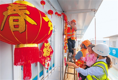 “虽然今年不回老家过年,但能和家人一起,感到很温暖。”2月7日,在中建一局海口国际免税城项目生活区,王楠抱着自己的女儿开心地和同事们一起挂灯笼。春节将至,在中建一局海口国际免税城项目施工现场,仍有196名来自河南、重庆、吉林等省市的建设者坚守岗位。当天,施工单位负责人为留在工地过年的管理人员及农民工发放了“春节礼包”,送去新春祝福。本报记者 袁琛 摄