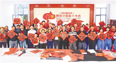 ① 2月7日,海口市秀英区永兴镇博强村乡村振兴工作队组织开展以“翰墨书香迎新春 文化惠民暖人心”为主题的活动。图为村民展示书法家书写的“福”字。