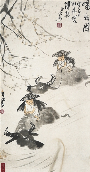 近代以来,我国也涌现出许多画牛的名家,其中以李可染最有代表性。李可染是齐白石的弟子,齐白石的虾、徐悲鸿的马、黄胄的驴、李可染的牛,被称为20世纪“中国水墨四绝”。牛是李可染先生一生喜爱描绘的对象,从20世纪40年代开始,一直到他生命结束,他留下了许多以牛为题材的精彩作品。