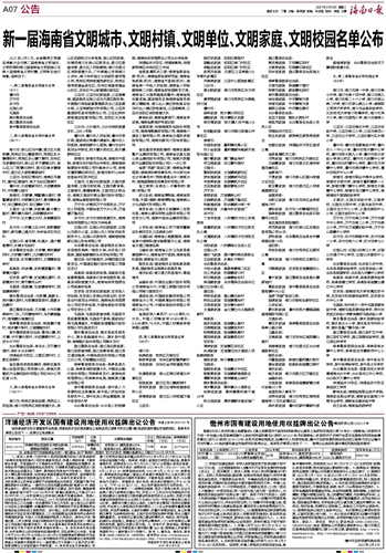 新一届海南省文明城市、文明村镇、文明单位、文明家庭、文明校园名单公布