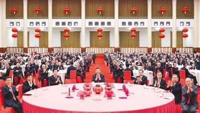 人民大会堂宴会厅灯光璀璨、暖意融融,各界人士约1000人欢聚一堂、共迎新春,欢声笑语间洋溢着喜庆祥和的节日气氛。