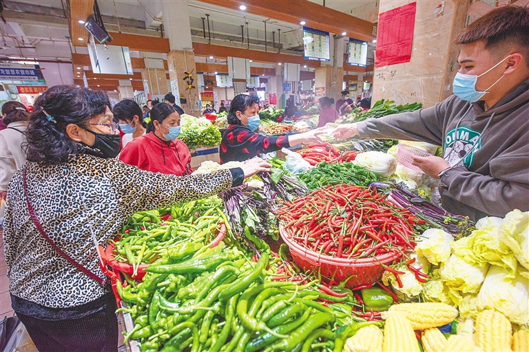 2月9日,在海口市美兰区白龙农贸市场,前来买菜的市民络绎不绝。据了解,近日我省各市县积极发挥平价商店、平价销售点的公益性作用,加大平价菜投放力度,满足市民购买平价蔬菜、平价肉的需求。一些平价菜销售点的蔬菜售价比市场价格低15%以上。本报记者 袁琛 摄