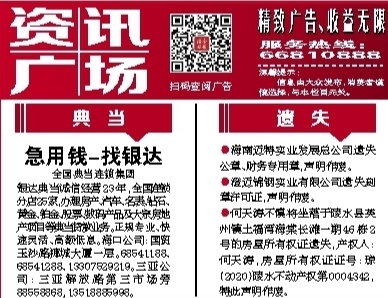 银达典当诚信经营23年,全国连锁分店25家,办理房产、汽车、名表、钻石、黄金、铂金、股票、数码产品及大宗房地产项目等典当贷款业务。正规专业、快速灵活、高额低息。海口公司:国贸玉沙路椰城大厦一层。68541188、68541288、13307529219。三亚公司:三亚解放路第三市场旁 88558868,13518885998。