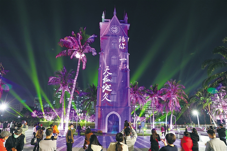 为迎接新春佳节,海口钟楼从农历除夕当晚开始亮起灯光秀。灯光秀将持续至2月21日。 本组图片均由本报记者 李天平 摄