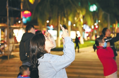 2月11日,市民游客在观看海口钟楼的灯光秀。
