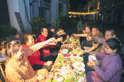 2月11日,在海口骑楼老街,相邻店铺商户围坐在一起吃年夜饭,共迎新春。为了服务市民游客,聚餐的商户春节期间继续营业,每年相约吃年夜饭已成为他们的传统。本报记者 李天平 摄