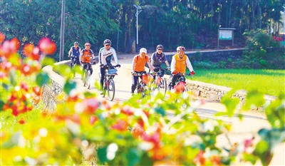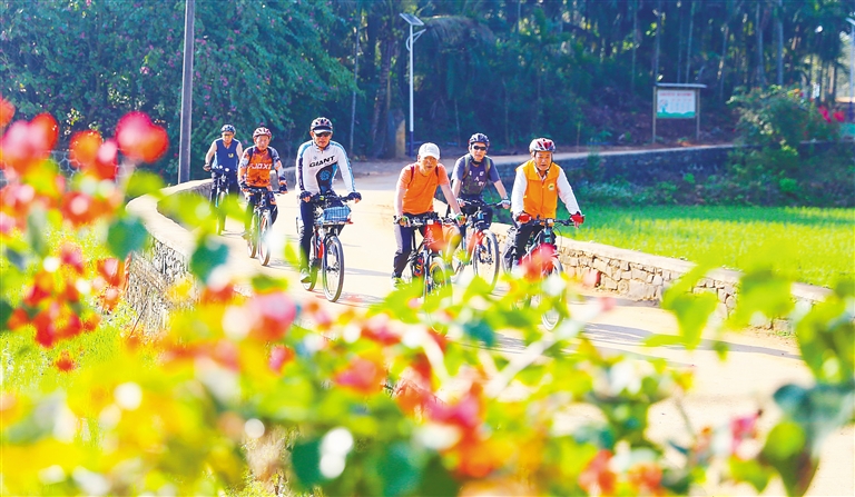 2月14日,大年初三,游客在历史文化名村定安县龙湖镇高林村田间骑行,感受深厚的历史文化底蕴与优美的自然环境。本报记者 张茂 摄