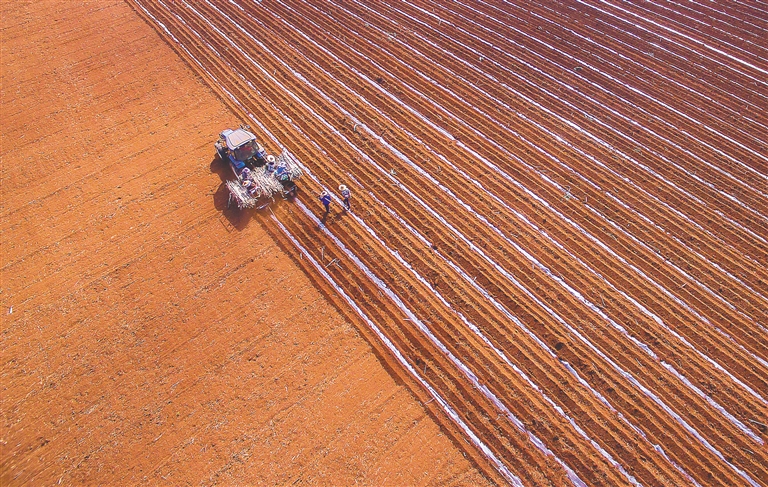 湛江市,甘蔗地里处处闪现着忙碌的身影,耕地、播种、施肥、覆膜、管护;