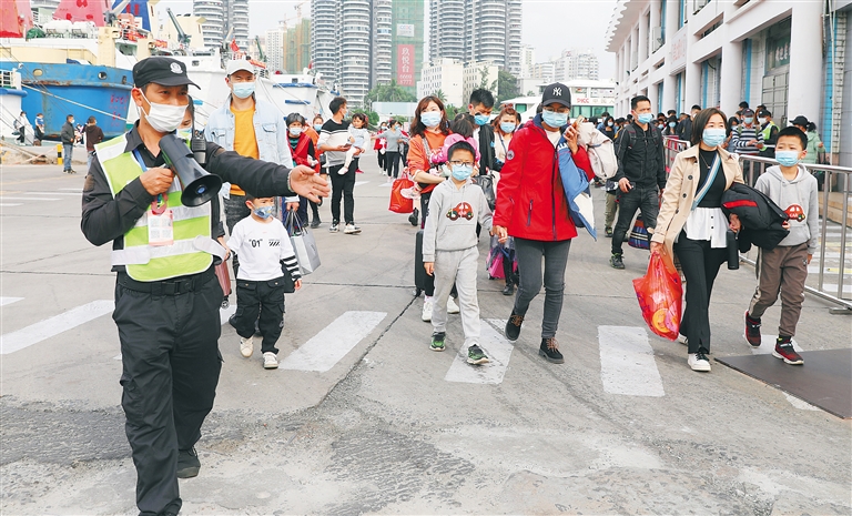 海南日报记者在港口看到,返琼旅客从上岸到出港,全程都有工作人员引导,在出示安全的健康码和行程码后可以迅速出港。