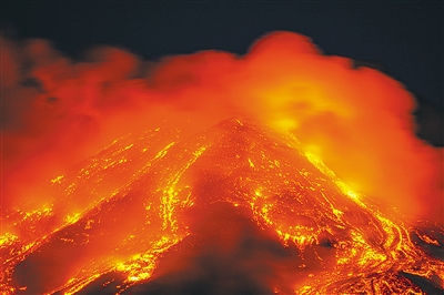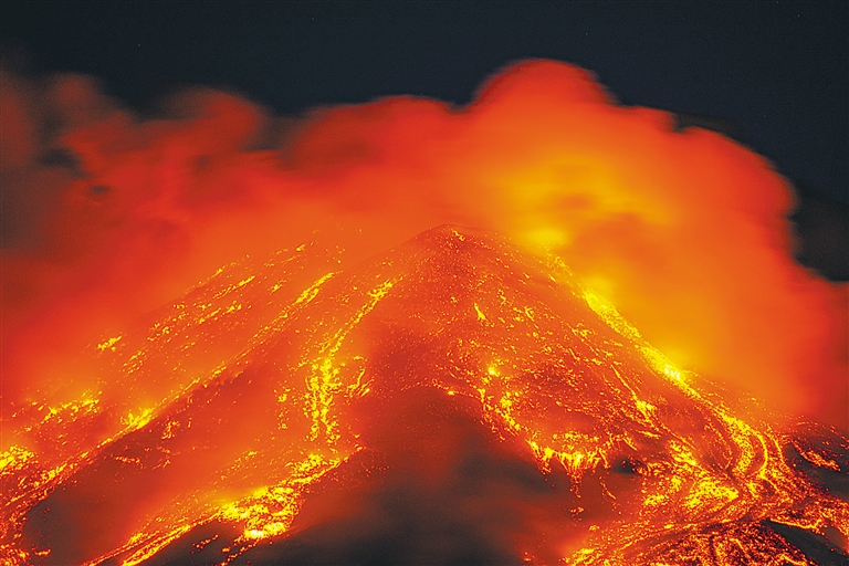 这是2月16日在意大利西西里岛拍摄的喷发中的埃特纳火山。欧洲最高活火山、位于意大利西西里岛的埃特纳火山近日再次喷发。 新华社/美联