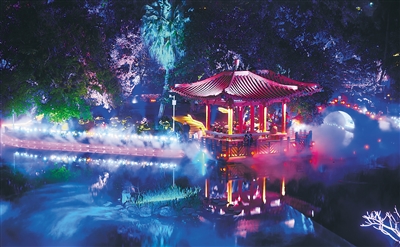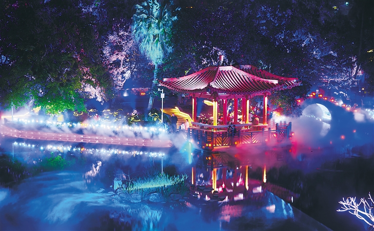 每晚18:00—24:00,灯光亮起,红墙内满园火树银花,梦幻绮丽……自2月1日起,到海口五公祠夜游已成为海口市民游客夜生活的新选择。