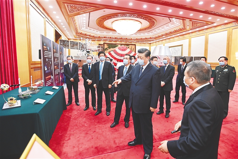 新华社北京2月22日电 中共中央总书记、国家主席、中央军委主席习近平22日上午在北京人民大会堂会见探月工程嫦娥五号任务参研参试人员代表并参观月球样品和探月工程成果展览,充分肯定探月工程特别是嫦娥五号任务取得的成就。他强调,要弘扬探月精神,发挥新型举国体制优势,勇攀科技高峰,服务国家发展大局,一步一个脚印开启星际探测新征程,不断推进中国航天事业创新发展,为人类和平利用太空作出新的更大贡献。
