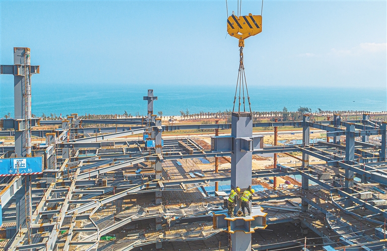 2月22日,位于海口江东新区的国际能源中心项目施工现场,工人正在作业。