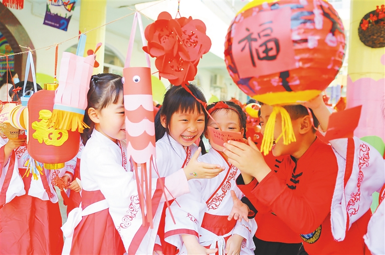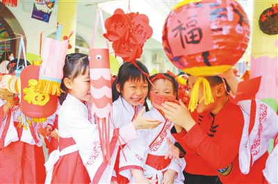 2月26日,在海南省直属机关第二幼儿园,小朋友们身着汉服参与元宵活动。