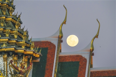 2月26日,一轮圆月从泰国曼谷大王宫建筑群背后升起。当日是元宵佳节。 新华社记者 张可任 摄