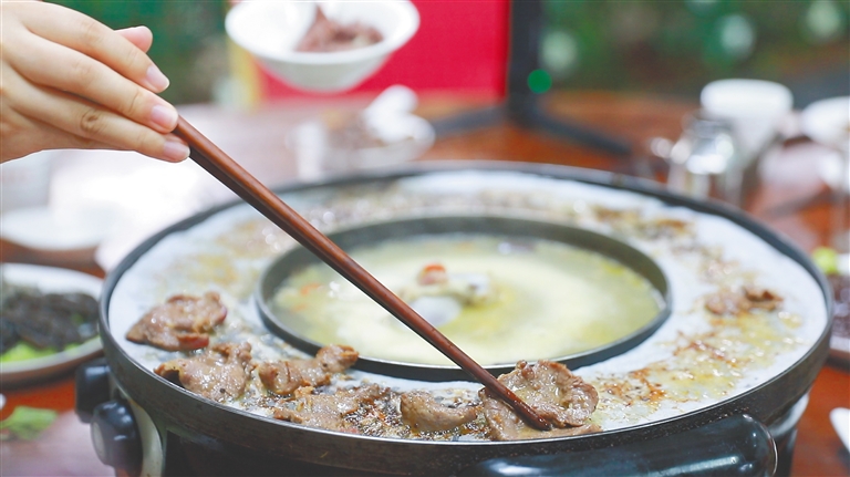 定安最流行的牛肉吃法是用子母锅,可以煎也可以涮。中间的子锅烹煮着清甜的牛肉高汤,用来涮牛肉。外圈的母锅被铺上一层烧烤纸,用来煎烤牛肉。因为吃法不同,切出来的牛肉也不一样,用来煎的牛肉要切成薄片,用来煮的牛肉略带肥花,成条块状。切成薄片的牛肉用酱料腌过,在煎锅上两边煎至变色,蘸上店家特制的什锦酱,牛肉入口弹牙,那感觉就两个字:鲜和嫩。