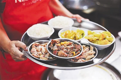 除了涮和煎,各餐饮店也提供热菜,比如香煎牛肝、炸牛排,牛排两面金黄,极为入味。再来一份定安菜包饭,新鲜的菜叶包着入味的米饭下肚,满满的幸福感。