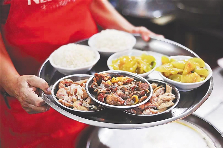 每天饭点前,位于定安县定城镇思源路的仙沟牛肉美食一条街热闹非凡,路边一侧成排的牛肉摊不时传出叫卖声,另一侧的餐饮加工店内,也在为即将到来的生意忙碌着。