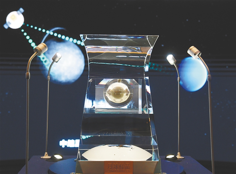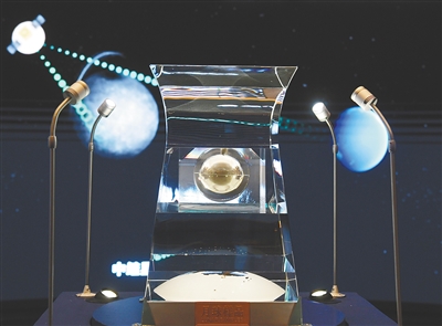 展厅里,水晶容器中的月球样品在灯光下熠熠生辉。围绕着月球样品,同时展出探月工程相关科技实物40余件,辅以大量图片资料、动态图片和视频资料。
