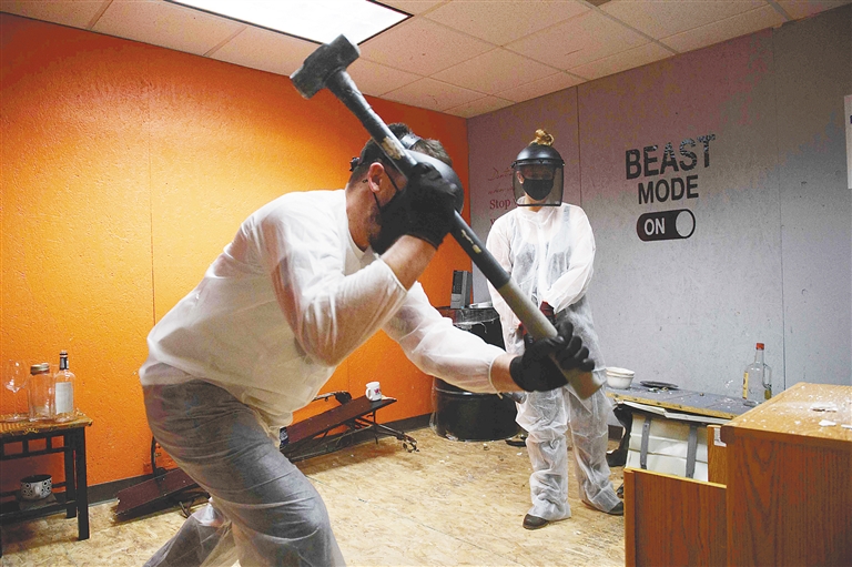 这家“愤怒小屋”为顾客提供“破坏”服务,顾客可以选择不同方式毁坏物品,以发泄负面情绪。 新华社/法新