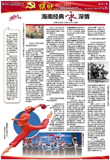 与海南有关的红色歌曲,其广泛传唱也离不开历史上一部部重磅级的文艺佳作。数十年来,文艺工作者们围绕“红色娘子军”这一题材创作出芭蕾舞剧、电影等多种不同类型的艺术佳作。艺术作品直接推动着红色歌曲的流行。