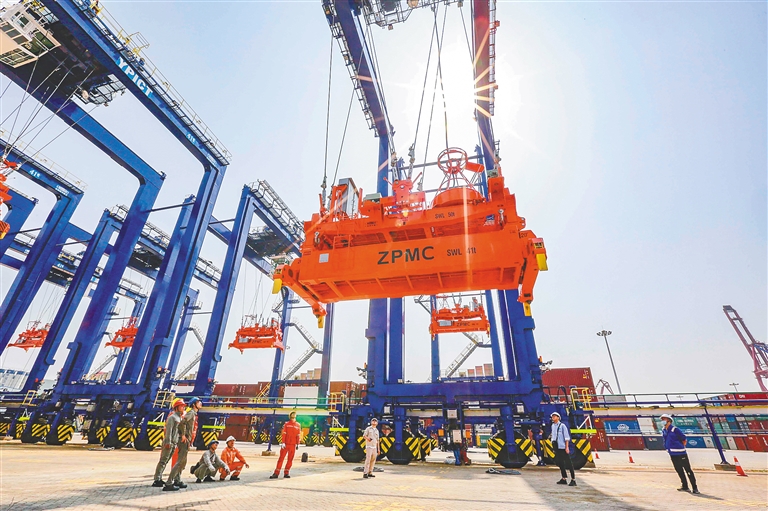 近日,在洋浦经济开发区国际集装箱码头起步工程能力提升项目施工现场,工作人员正安装设备。