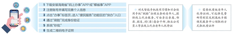 “不用提交纸质材料,也不用跑实体大厅,用手机‘刷脸’验证,快速通过审核后,老年人可立即获得优待证电子证照。”澄迈县行政审批服务局局长宋立秋介绍,以往办理老年人优待证,办理人需到居住地乡镇便民服务中心提交纸质申请表、一寸彩照等10余种材料,如今只需下载安装海南省“码上办事”APP或“椰省事”APP,注册账号并填写完善个人信息,点击“办事”标签页,进入“便民服务”功能区的“快办”入口,便可在线完成办证。办理人进入身份验证页面,通过人脸识别完成身份验证后,系统“秒批”,即可生成带有二维码的电子证照,便于线上线下使用。与此同时,结合部分老年人需要纸质证件的实际情况,优待证电子证照办理成功后,办理人可选择免费邮寄到家或到属地乡镇便民服务中心领取的方式取纸质证件。