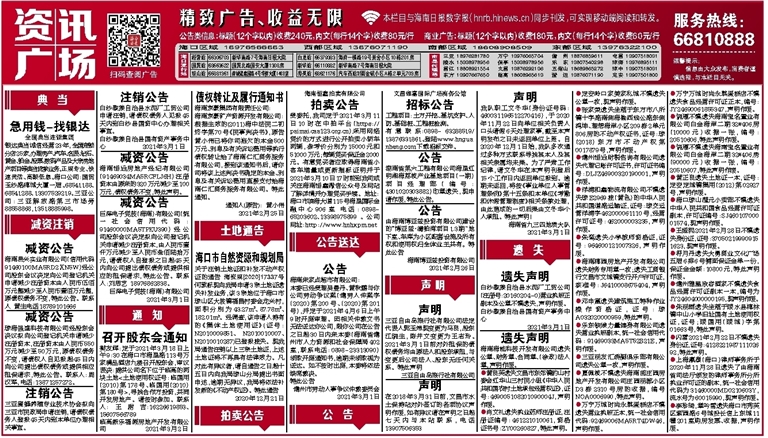 受委托,我司定于2021年3月11日10时在中拍平台(https://paimai.caa123.org.cn)采用网络竞价的方式进行公开拍卖小轿车两辆,参考价分别为15000元和51000万元;每辆竞买保证金2000元。有意竞买者应取得海南省小客车增量或更新指标证明并于2021年3月10日17时前到我司或关注海南恒鑫微信公众号及网站了解详情并办理竞买手续。地址:海口市滨海大道115号海垦国际金融中心906室 电话:0898-65203602、13398975899。公司网址:http://www.hnhxpm.net