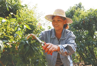 图为海口永兴镇建群村脱贫村民王春娃修剪荔枝。王春娃一家有35亩荔枝树,去年在当地政府部门直播带货等措施帮扶下,丰收的荔枝给她带来可观的收入。本报记者 李天平 摄