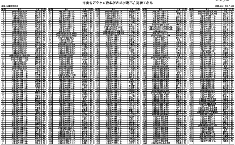 为切实解决万宁市兴隆华侨农场社保遗留问题,维护职工合法权益,确保社保补缴工作顺利开展,现将我场长期不在岗的304名在册职工名单予以公告,请上述人员于2021年3月10日前主动与我场联系,处理本人的社保遗留问题。没有正当理由逾期不联系,由此产生的不良后果由本人承担。兴隆华侨农场联系人:梁膑友。联系电话:15289956201/0898-62552347。特此公告。