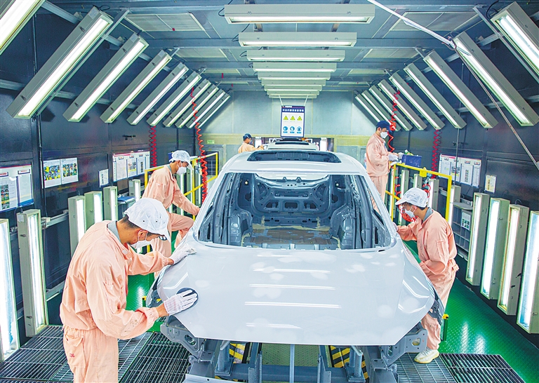 2021年3月1日,在海马汽车海口基地的生产车间,工人对车辆进行面漆前打磨。
