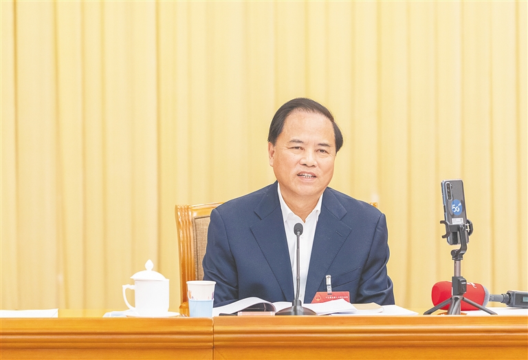 3月7日,出席十三届全国人大四次会议的海南代表团在住地举行会议,审查预算报告和草案、计划报告和草案。图为刘赐贵代表在发言。