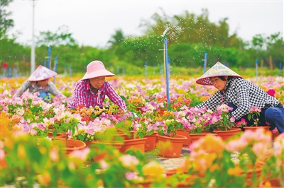 定安县定城镇深田村的三角梅花卉产业基地里,村民利用晴好天气给花除草。