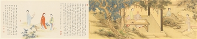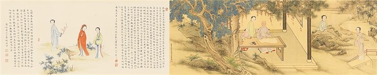 值得一提的是,《随园女弟子湖楼请业图》中的“随园”是袁枚的居所,“随园”原为曹雪芹祖上的园林,有说法认为随园就是《红楼梦》中大观园的原型。书中贾宝玉曾云:“女儿是水做的骨肉,男人是泥作的骨肉”,《红楼梦》对众多才貌双全女子的描写无不是对女性美的歌颂,这恰巧与《随园女弟子湖楼请业图》似有暗合之处。
