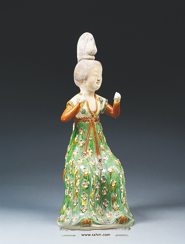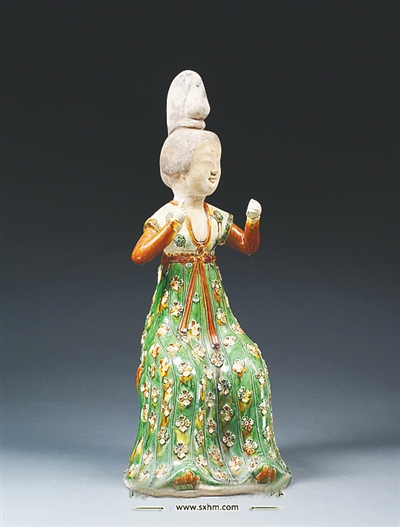 陕博所藏的另一件唐三彩梳妆女俑则将唐代女性华丽和开放的衣着展示得淋漓尽致:这件女俑似还是一位少女形象,正坐在铜镜之前梳妆打扮。只见她发髻高耸,面部丰腴,身着小袖腰襦,长裙之上遍绣四叶瓣的柿蒂花。她左手半握举于胸前,应是持镜照面;右手指向面部,可能要“对镜贴花黄”。通过简单的动作设计,静止的仕女俑变得灵动起来,逼真地刻画出唐代女子梳妆时的动态场景。仕女俑的裙腰则系至腰部以上接近于腋下,由此裙子便显得被拉长,女俑的体态呈现出修长的美感。另外这件女俑的衣着也属于袒胸装的范畴,描绘唐代女子的绘画《捣练图》和《簪花仕女图》等,女性的衣着也多是袒胸装,这种装束是唐代女性大胆开放的心态体现,也充分展示出具有旺盛生命力的丰腴之美。除却宽松的社会风气外,这种着装可能与第一位女性皇帝武则天登基改国号,女性地位提高等也有着密切的关系。